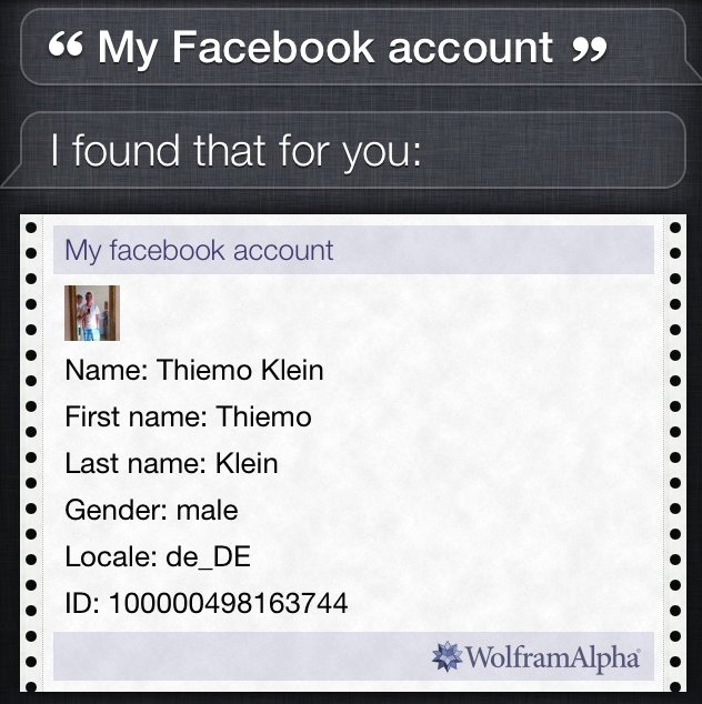 then a SiriAddViews appears (The same frame like WoflramAlpha) with your pofilepicture, your name, your gender, your birthday, your facebook link, your facebook ID